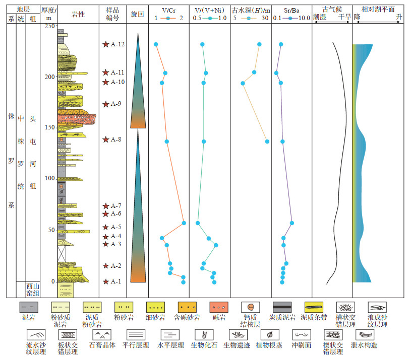 Sr/Ba是古盐度判别的有效指标。一般而言当Sr/Ba值小于0.6,0.6~1.0和大于1时分别指示淡水、半咸水和海水沉积[38]。在实际研究中,不同地区的Sr/Ba值存在很大差异,徐子苏[39]在准噶尔盆地西北缘大西沟地区测量的头屯河组Sr/Ba值为0.15~1.46,与此次研究测量的值(0.15~0.97)较为接近,且呈先增后减的变化趋势(图 5)。表明头屯河组沉积早期湖水含盐量升高,此时湖水的蒸发量大于降雨量,指示了当时气候逐渐干旱炎热,在中晚期气候又开始趋于潮湿的特点。