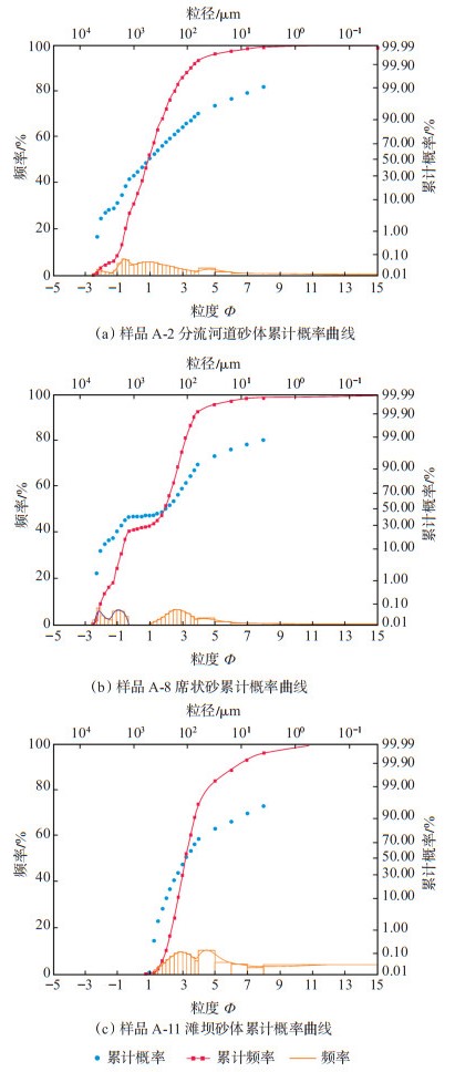 2.5 粒度分布特征选取研究区内典型样品进行粒度分析,从而对不同相带的沉积物搬运介质、水动力条件进行研究。从粒度累计概率曲线形态来看,可划分出3种类型的曲线:二段式、三段式和四段式。三段式曲线由滚动总体、跳跃总体和悬浮总体构成,跳跃总体概率多为70%~80%,曲线倾角为65°~70°,标准偏差为1.79,偏度为正,沉积物分选较差;跳跃总体与悬浮总体交点在粒度Φ值2.0左右,反映中等的稳定牵引流沉积特点(图 6a)。四段式总体由2个跳跃总体、1个悬浮总体和1个过渡总体构成,跳跃组分概率约为50%,悬浮总体累计概率小于10%,跳跃与悬浮总体间的交点粒度Φ值为2.0~3.5(图 6b),反映在河流进入水下后,能量减弱,悬浮物快速堆积的特征。头三段样品沉积物粒度极小,粒度曲线以二段式为主,由跳跃和悬浮2个组分构成,跳跃组分与悬浮组分的交点Φ值为3.27,两者之间圆滑接触,曲线倾角约为70°(图 6c),显示砂体分选较好,反映了波浪对沉积砂体的冲刷和回流作用,具湖滩砂特点。