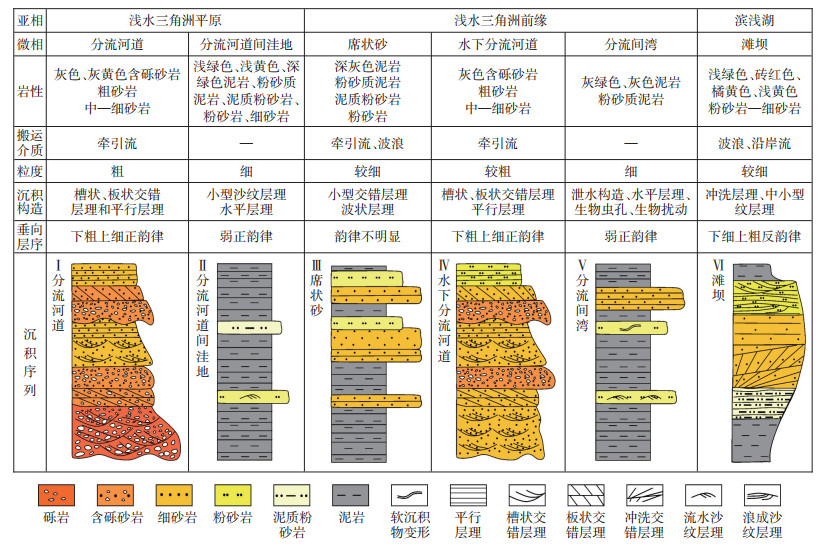根据头屯河组的沉积相标志划分南安集海河剖面的沉积微相类型。研究区沉积相可划分为浅水三角洲平原、浅水三角洲前缘和滨浅湖3个沉积亚相(图 7)。头一段沉积早期发育浅水三角洲平原,中期发育浅水三角洲前缘,晚期发育滨浅湖泥岩沉积;头屯河组二段沉积早期为浅水三角洲平原沉积,中晚期为浅水三角洲前缘沉积;头三段主要发育滨湖滩坝沉积。