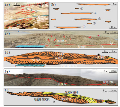 头屯河组分流河道具有拼接式和切叠式2种接触样式。头一段①号河道可划分为3期,最大一期河道横向延伸约50 m,纵向上厚8 m,具明显冲刷充填构造,多期河道在横向呈半接触的拼接样式。在露头上表现为河道砂体呈带状零散分布(图 8a,8b),纵向上被泥质夹层隔开,具有明显间断性正韵律的二元结构(图 8c,8d)。头二段⑥号分流河道相互切叠,岩性以棕褐色细砾岩、砂砾岩和颗粒支撑的砂岩为主(图 8e,8f)。河道规模大且呈豆荚状并联模式,河道砂体相互侵蚀切割,横向延伸达250 m,纵向上厚17.5 m,宽厚比显著增大,这主要是由于阵发性洪流发育、河道频繁改道、原河道经常受到河流的二次侵蚀所形成。