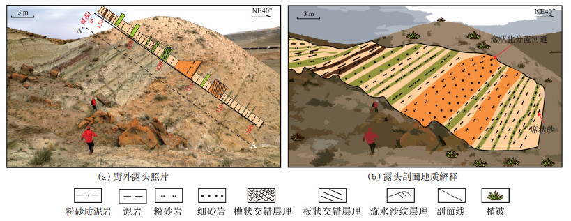 浅水三角洲是一种发育于水体较浅、构造稳定、物源供给充足、地形相对平缓的沉积环境的特殊三角洲类型[1-3]。国内外众多学者针对不同地区浅水三角洲沉积特征做了大量深入研究,揭示浅水三角洲的水动力特征、微相类型及内部结构与典型三角洲有很大不同[4-6],具体表现为浅水三角洲一般以河流作用为主,以分流河道及水下分流河道为骨架砂体,不具备吉尔伯特型(Gilbert)三角洲顶积层、前积层和底积层的3层式剖面结构[7-9]。然而,目前很多研究显示,由于浅水湖盆坡度较小,在干湿交替气候环境下,极易导致湖平面高频振荡,形成一种河流与波浪共同作用的浅水三角洲[10-12]。为此我国学者相继提出了湖平面波动[10-11]、湖岸线变迁[13]、河湖交汇[14]等因素控制下的浅水三角洲沉积模式。这些模式均体现了波浪作用对前缘砂体的影响,并控制了浅水三角洲的沉积特征及发育模式[15],然而这些研究大多是通过分析地下及现代沉积完成的,缺少直观的野外露头资料。目前这种类型的浅水三角洲沉积模式研究尚需更多的研究实例进行佐证并完善。