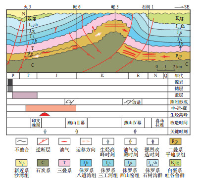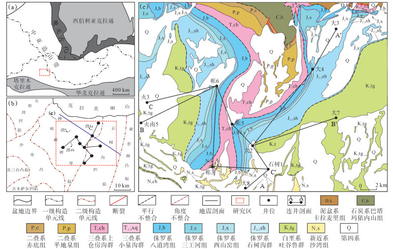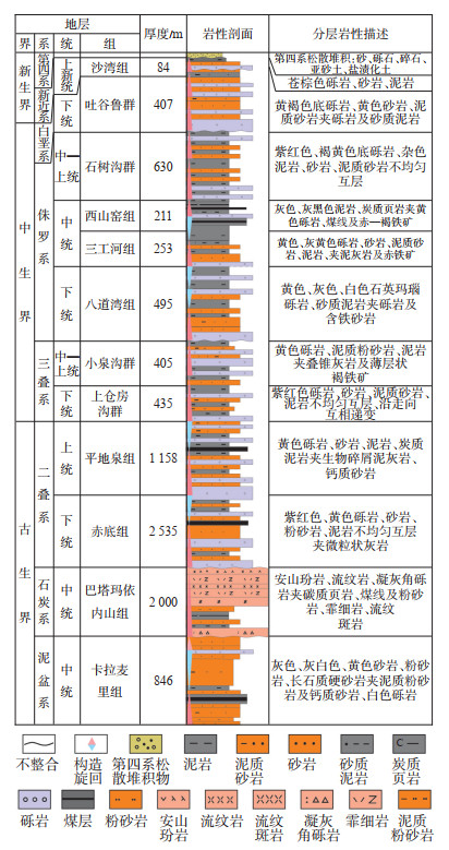 帐篷沟地区古生代出露石炭系巴塔玛伊内山组(C2b),二叠系赤底组(P1c)和平地泉组(P2p),从实际勘探来看,平地泉组烃源岩厚度大、分布广,是区域内最重要的现实性烃源岩。中新生界自下而上为三叠系上仓房沟群(T1ch)、小泉沟群(T2-3xq),侏罗系八道湾组(J1b)、三工河组(J2s)、西山窑组(J2x)、石树沟群(J2-3sh),白垩系吐谷鲁群(K1tg),新近系沙湾组(N1s)以及第四系(Q)(图 2)。由于多期构造运动的影响,中新生代地层遭受了不同程度地强烈改造和剥蚀,白垩系以下地层发生强烈褶皱变形,以上地层构造变形强度相对减弱,但剥蚀程度很大[15]。