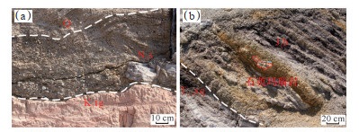 下载原图 图 3 准噶尔盆地东部帐篷沟地区野外露头不整合接触界面 (a)第四系 Q/新近系沙湾组 N1s、新近系沙湾组 N1s/白垩系吐谷鲁 群 K1tg;(b)侏罗系八道湾组 J1b/三叠系小泉沟群 T2-3xq。 Fig. 3 Field unconformity contact interface in Zhangpenggou area, eastern Junggar Basin |