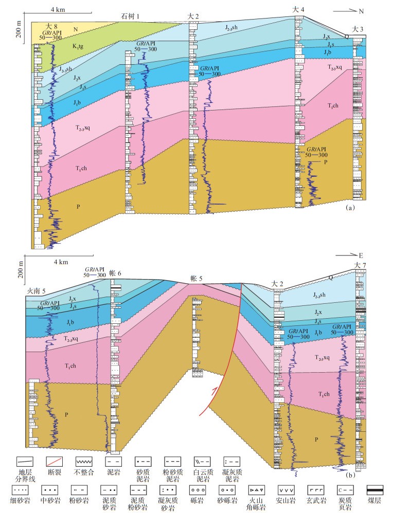 南北向剖面(大8井—石树1井—大2井—大4井—大3井)(图 4a)显示,帐篷沟地层整体具有北高南低的特征,发育4期不整合:①二叠系、三叠系沉积厚度大,且由北向南地层厚度呈减小趋势,此时的沉积中心在北侧,下三叠统上仓房沟群与下伏二叠系呈角度不整合接触;②侏罗系整体向北抬升,底界不整合在剖面上非常明显;③南部大2井和大4井钻遇中—上侏罗统石树沟群,而北部石树1井和大6井未钻遇该地层,石树沟群由于后期构造运动导致部分地区被部分剥蚀,与上覆白垩系地层呈角度不整合接触;④南部大8井、石树1井钻遇下白垩统吐谷鲁群,北部大2井、大4井、大3井钻井结果均显示该地层缺失,地层尖灭点位于石树1井与大2井之间,吐谷鲁群向北超覆尖灭,与上覆古近系呈角度不整合接触,古近系地层只在大8井有钻井显示,大2井、大4井、大3井新生代地层几乎全部缺失。