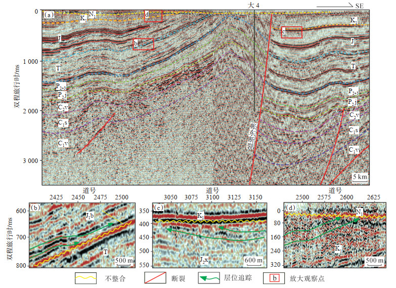 2.1.3 地震剖面从研究区北西—南东向地震测线追踪中新生代地震地质层位,识别出3期区域不整合(图 5)。