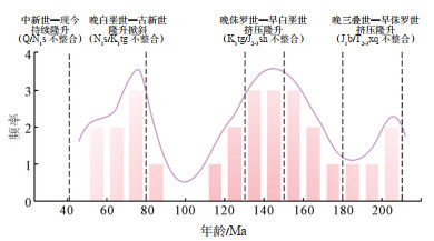 2.2 磷灰石裂变径迹年龄调研准噶尔盆地东部帐篷沟周缘地区的磷灰石裂变径迹数据(表 1),发现样品岩性以砂岩为主,部分为花岗岩,另有少量的闪长岩、凝灰岩,测试矿物均为磷灰石;样品中值年龄为197.0~41.6 Ma,所有样品的表观年龄都远小于其真实地质体的年龄,说明均经历了不同程度的退火作用,磷灰石径迹长度为11.10~14.60 μm,标准差为0.22~2.70 μm,小于原始径迹长度16.30 μm,属于较短径迹,反映经历的退火作用较强。磷灰石裂变径迹年龄分布直方图显示年龄组具多峰分布特点,表明岩体经历了复杂的冷却隆升历史(图 6)。