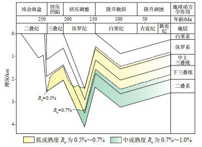 二叠纪以来,帐篷沟地区处于稳定的大型陆内坳陷演化阶段,构造活动弱,在辫状河三角洲-湖泊沉积环境下,区域地层整体沉降,持续接受碎屑沉积,中二叠统平地泉组发育的油页岩、泥岩,成为研究区最重要的烃源岩。单井热演化史(图 7)显示:三叠纪中期帐篷沟地区油气进入生烃门限,此时烃源岩成熟度较低,油气尚未大量生成;三叠纪末克拉美丽造山带向盆地逆冲,帐篷沟地区隆升剥蚀,生烃过程发生停滞[4];早—中侏罗世,研究区在伸展构造背景之下再次进入稳定沉降期,此时地层达到最大埋深,二叠系烃源岩开始大量生烃,进入主力生烃期;晚侏罗世,帐篷沟地区受到稳定的近东西向挤压应力,南北向断背斜构造初步形成,研究区遭到不同程度的抬升,之上被白垩系地层不整合覆盖,此阶段抬升剥蚀使二叠系烃源岩埋藏变浅,地层冷却,温度降低,生烃速率逐渐下降为零。整体而言,帐篷沟地区烃源岩的生烃过程受构造作用的控制,早期演化程度达到生烃门限,后期随构造事件的发生,地层抬升,生烃速率减缓或停滞,属于早生晚滞型成烃演化模式。