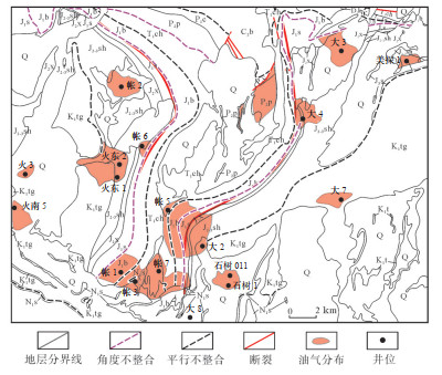 2 构造事件 2.1 不整合面自中新生代以来,准噶尔盆地东部地区经历了复杂的构造变形,形成了多期不整合。根据帐篷沟地区的野外露头、地震和钻井资料识别出中新生代存在4期区域性不整合,分别为侏罗系八道湾组与三叠系小泉沟群不整合(J1b/T2-3xq)、白垩系吐谷鲁群与侏罗系石树沟群不整合(K1tg/J2-3sh)、新近系沙湾组与白垩系吐谷鲁群不整合(N1s/K1tg)、第四系与新近系沙湾组不整合(Q/N1s)。