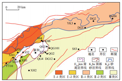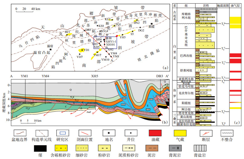 1 地质概况库车坳陷南部斜坡带位于塔北隆起北部,以北为秋里塔格冲断带,以南为塔北隆起带,西邻阿瓦提坳陷,东邻阳霞凹陷,整体呈东西走向的长条状,面积达1.5×104 km2。新和地区位于库车坳陷南部斜坡带中部,西邻英买力油气田,东接牙哈-大涝坝气田(图 1a)。区内在印支期和海西期的逆冲推覆构造运动下形成“北高南低”的古构造格局,后期在燕山—喜山期的南天山逆冲挤压作用下在其北部形成库车坳陷,导致库车坳陷南部斜坡带的北部随之沉降,形成“北低南高”的倒转单斜坡[10](图 1b)。中生界沉积前研究区内发育北东—南西向的继承性条带状古隆起,中生界地层超覆沉积于古隆起之上,直至白垩纪晚期隆起逐渐衰亡[11]。