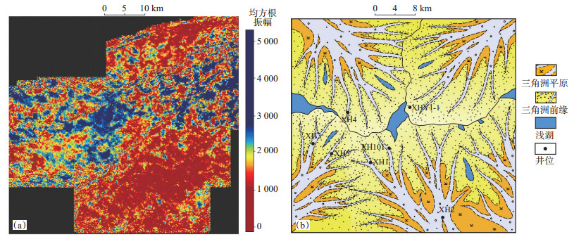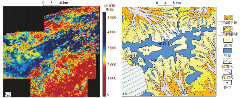 下载原图 图 11 库车坳陷新和地区白垩系巴什基奇克组顶部湖侵体系域沉积期均方根振幅属性(a)及沉积相展布(b) Fig. 11 RMS attribute(a)and sedimentary facies distribution(b)of transgressive system tract at the top of Cretaceous Bashijiqike Formation in Xinhe area, Kuqa Depression |
