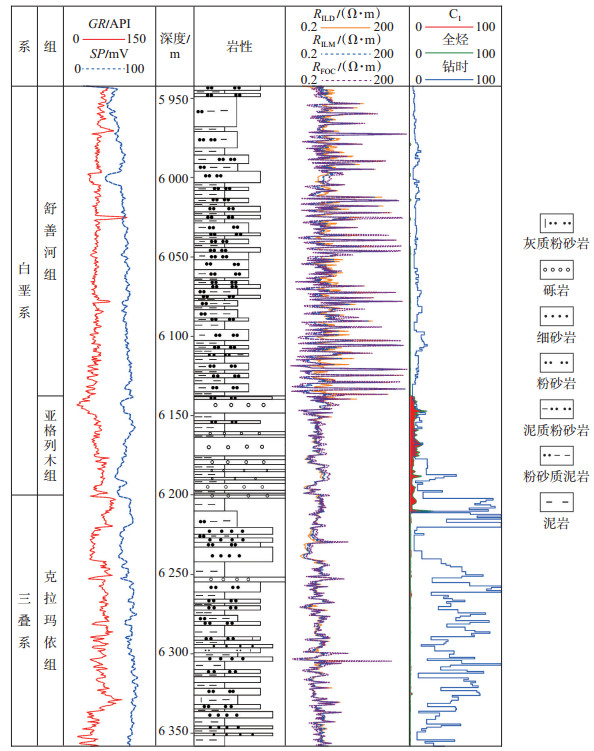 库车坳陷南部斜坡带中—新生界陆相碎屑岩地层发育较为齐全。晚二叠纪—三叠纪是库车坳陷前陆盆地发育期,盆地呈楔形分布,自北向南逐渐减薄,主要为三角洲和湖泊沉积。盆地边界发育洪积扇、扇三角洲和辫状河三角洲沉积,向盆地中心发育滨浅湖、半深湖—深湖相沉积。侏罗纪延续三叠纪盆地演化,表现为持续、稳定的河湖相沉积特征,盆地沉积早期为辫状河—辫状河三角洲沉积、中期为曲流河—三角洲沉积、后期为三角洲—浅湖相沉积[12-15]。新和地区由于构造剥蚀作用强烈,普遍缺失侏罗系地层。白垩系沉积时期,由于侏罗纪后期的构造抬升作用,地层往南部塔北隆起呈上超沉积充填,以冲积体系发育为主,为稳定的河流—湖泊沉积。古近纪盆地继承了白垩纪晚期干旱气候,碳酸盐岩及细碎屑岩发育,为三角洲—滨浅湖相沉积[16-21]。区内发育多套储盖组合,含油层系众多,主要产层为库木格列木组(E1-2km)、巴什基奇克组(K1bs)、巴西改组(K1b)、舒善河组(K1s)、亚格列木组(K1y)等层系(图 1c)。