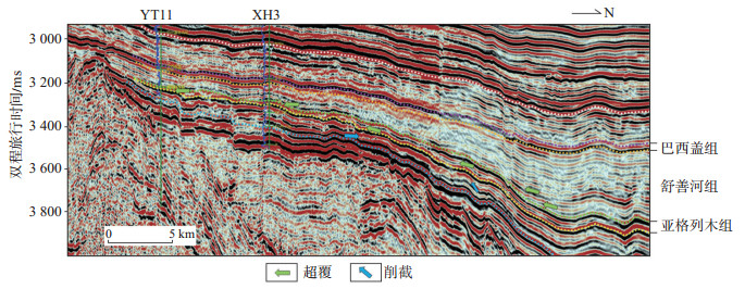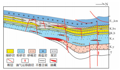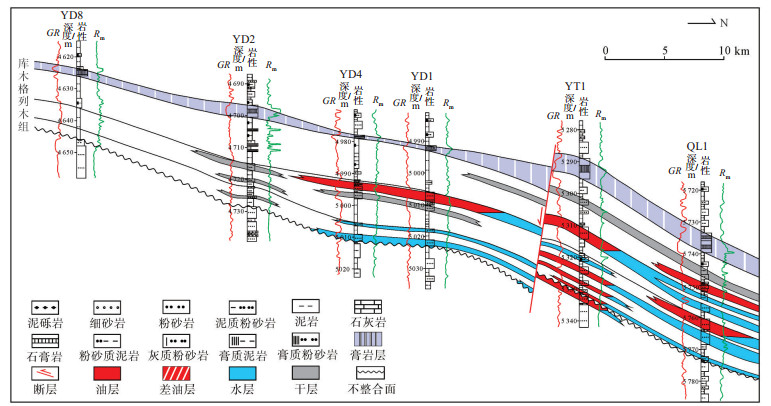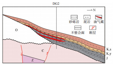 至燕山中晚期,随南天山造山带不断向南挤压推覆,湖盆开始扩张,在雅克拉凸起之上的前震旦系花岗岩可为南北两侧凹陷区提供物源[26-27]。侏罗纪—早白垩世亚格列木组沉积时期,受古隆起控制,在区域湖侵背景下发育一系列冲积扇和退积型辫状河三角洲[28-29]。DG2井J-K1y地层主要发育细砾岩及含砾石英砂岩,粒度较大,为近物源沉积,在持续的水进背景下,湖平面逐渐向高部位超覆。至白垩系舒善河组沉积期,湖盆进一步扩大,沉积了厚层的泥岩和粉砂质泥岩(图 2),为下伏J-K1y地层提供了良好的顶板条件。在沉积地层向古隆起逐期超覆的背景下,侏罗系—白垩系亚格列木组储层被上下2套非渗透性地层所“夹持”形成地层超覆圈闭(图 3)。雅克拉断凸为一狭长的北东东向大型断垒[24],因此,西至羊塔—新和地区,东至库东轮台,沿断凸南北两侧皆有地层超覆尖灭的存在,可形成规模地层超覆圈闭群,勘探潜力较大。