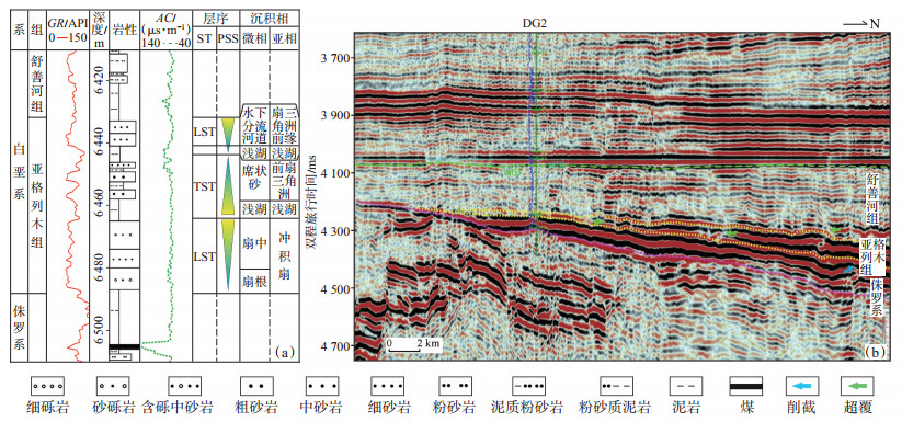 下载原图 图 2 库车坳陷南部斜坡带DG2井白垩系综合柱状图(a)及过DG2井南北向地震剖面(b) Fig. 2 Stratigraphic column of well DG2(a)and NS seismic section across well DG2(b)in the southern slope of Kuqa Depression |