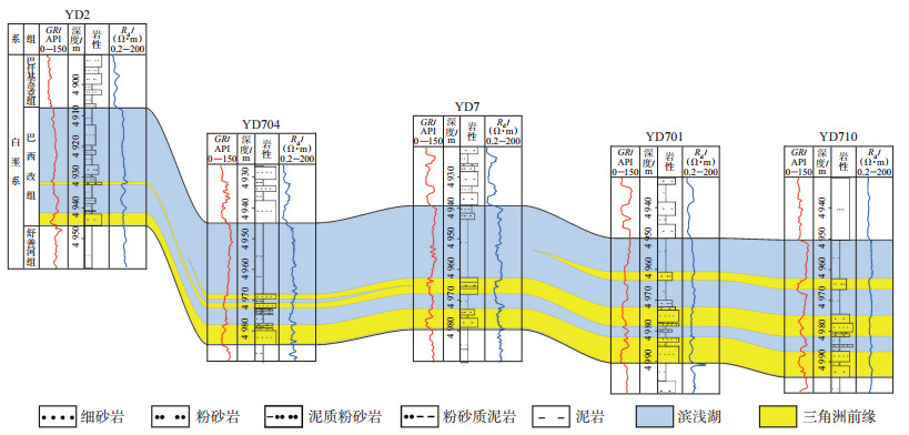 下载原图 图 4 库车坳陷过YD2—YD710井白垩系巴西改组连井对比剖面 Fig. 4 Well-tie profile of Cretaceous Baixigai Formation across wells YD2 to YD710 in Kuqa Depression |