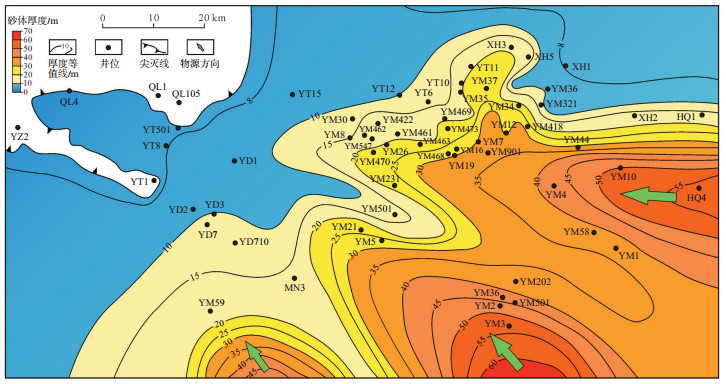 在低幅度构造高点部署的YD7井对白垩系巴西改组(4 964~4 965 m)射孔试油,获日产原油63 m3。但通过勘探开发的不断深入,发现YD7油藏的边界远大于局部背斜的边界。结合区域沉积、构造背景的解剖,认为该油藏为砂岩上倾尖灭岩性油气藏,而此类圈闭的发育主要受控于两大要素:湖侵背景下发育多期退积砂体和后期构造掀斜改造;物源方向与现今地层倾向相反,可形成砂岩上倾尖灭(图 4)。