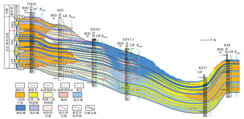 通过分析沿物源方向的区域连井相剖面可知,巴什基奇克组顶部发育完整的三级层序,受白垩纪末构造剥蚀作用的影响,除南部地区仍残留高位体系域外(YM10井和XH2井),北部大部分区域仅保留低位体系域和湖侵体系域。低位体系域沉积时期,砂地比较大,南北两大物源体系交汇、砂体连通程度较高,砂体垂向叠置、横向变化慢且连片分布。除XHY1-1井发育少量孤立滩坝砂体,可形成砂岩透镜体岩性圈闭外,其余单井砂地比普遍为60%~90%,不利于规模岩性圈闭的发育;至湖侵体系域,各井砂地比普遍减小,泥质含量增加,至XHY1-1井砂地比降至40% 以下。侧向上,从南北两侧近物源区钻井向湖盆中心过渡,砂地比逐渐减小,砂体减薄、连续性变差。整体湖侵背景下发育多期退积型三角洲-滩坝砂体,有利于岩性圈闭的发育。