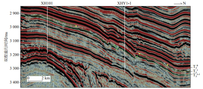 通过精细井震标定,发现研究区巴什基奇克组顶部砂体由低位体系域(T31-1)向湖侵体系域(T31)转变(图 8)。低位体系域沉积时期(T31-1),砂体连续程度较高、单砂体厚度较大,在地震剖面上表现为强振幅、高连续的反射特征。至湖侵体系域沉积期(T31),受湖侵作用影响南北两侧物源体系连续性变差,近物源处水下分流河道砂体厚度较大,地震反射振幅较强;向湖盆中心(XHY1-1井)方向过渡,砂地比减小,发育砂泥互层或泥岩段,地震同相轴出现明显的减薄和尖灭现象(图 9)。此外,在纵向上可见清晰的退积反射结构(图 9),说明浅湖泥岩可分隔南北两侧的沉积砂体,其中北部的三角洲沉积砂体可形成规模砂岩上倾尖灭圈闭,该模式与YD7井退积型砂岩上倾尖灭圈闭模式高度相似。因此,可以推断在XHY1-1井—KS13井发育上倾尖灭型岩性圈闭(图 7)。
