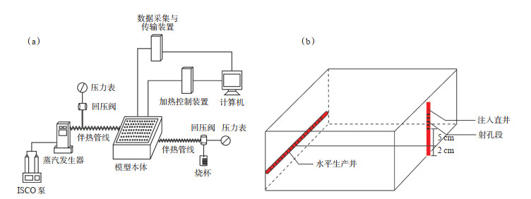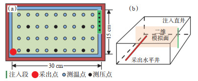 1.1 实验装置二维物理模拟实验是由模型本体、注入系统、数据采集系统组成(图 1)。模型尺寸为30 cm× 15 cm×5 cm,最大工作压力为2.5 MPa,最高耐温300 ℃,模型内壁安装隔热层,以减少实验过程中的热损失,并在模型外部接入加热板,用于饱和油前预热模型及实验过程中的热补偿。注入系统可实现定压或定流量2种模式的注入,高压泵将蒸馏水泵入过热蒸汽发生器(耐温300 ℃,耐压10 MPa),产生高干度蒸汽,注入及采出管线均安装伴热带进行热补偿,以减少注入蒸汽的热损失,既可保证蒸汽干度,同时也可防止采出管线堵塞。模型内部安装热电偶,共有测温点196个,热电偶连接数据采集系统,可以实现测温数据的实时采集并绘制温度场图。参考VHSD试验区直井与水平井组合的井型,设计了一口直井注汽井和一口水平生产井。水平生产井位于模型左下角距油层底部2 cm处,直井注汽井位于模型右上方,射孔位置与水平井垂向距离为5 cm。