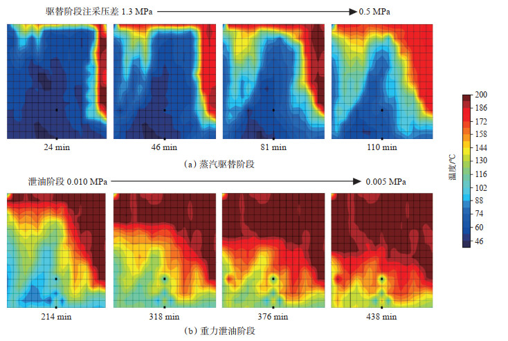 2 物理模拟实验结果分析 2.1 蒸汽腔前缘形态二维物理模拟实验开始24 min后,受蒸汽超覆及水平井泄压对蒸汽产生牵引的影响,高温带分布于直井注汽井附近及模型顶部,蒸汽腔前缘沿着顶部向水平井方向扩展,此时注采压差为1.3 MPa,蒸汽驱替起主导作用,处于蒸汽驱替阶段。随着蒸汽的持续注入,蒸汽腔前缘逐步向水平井方向扩展。当实验进行至110 min时,注采压差下降至0.5 MPa,在水平井上方逐渐形成泄油面,水平井上方温度逐步升高,重力作用增加,此时进入重力泄油阶段。当实验进行至214 min时,蒸汽腔前缘开始整体向下推进,水平井上方可观察到明显的泄油面。当实验进行到438 min时,模型的87.5% 以上完全被蒸汽前缘波及,生产达到极限(图 3)。