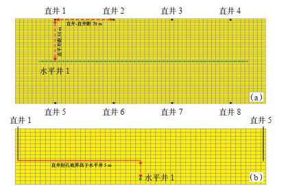 下载原图 图 5 数值模拟井网关系平面(a)和剖面(b)示意图 Fig. 5 Schematic diagram of numerical simulation well pattern plane(a)and section(b) |