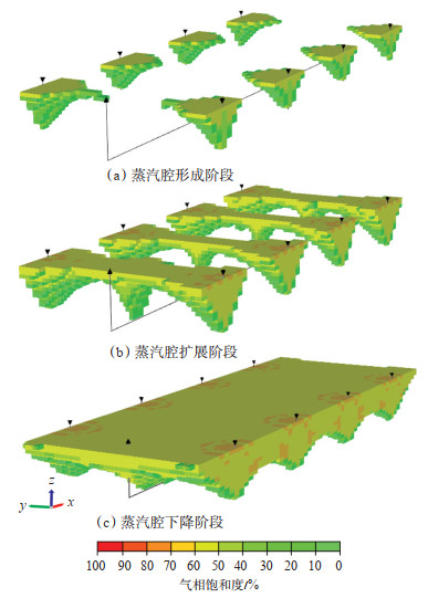 从蒸汽腔发育角度分析,在直井连续注入蒸汽转入驱泄复合开发后,注入蒸汽在直井周围逐渐占据被采出原油的空间而形成小的独立腔体,蒸汽腔在较大生产压差驱替作用下,沿注采井间水动力连通通道逐渐向水平井上方扩展。蒸汽腔在水平井泄压牵引作用下,逐渐下降至水平井上方,出现泄油点,此时的蒸汽腔呈倒三角形,直井周围蒸汽腔呈“孤岛”形,进入蒸汽腔形成阶段(图 7a)。随着注入蒸汽量的增加,水平井两侧的直井周围蒸汽腔沿直井连线在水平段上方逐渐汇聚,并逐步发育至顶部,呈现“廊桥”形,并由此开始横向扩展,进入蒸汽腔扩展阶段(图 7b)。随着开发的不断深入,水平段上方的泄油点逐渐连通成段,水平段动用程度也逐渐增加,蒸汽的波及体积不断扩大,水平段上方的蒸汽腔逐渐汇聚成一个大腔体,并整体发育至顶部,开始了蒸汽腔下降阶段(图 7c)。