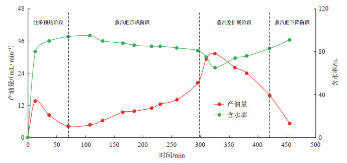 (1)注采预热阶段。该阶段操作压力较大,通过多轮蒸汽吞吐,井筒周围原油被采出,井间温场逐步提升,促使井间建立水动力连通,为注采预热阶段。该阶段蒸汽注入时间为70 min,产油量先升后降,最高达13.6 mL/min,含水率很快上升至95%,阶段采出程度为6.1%,油汽比为0.10。