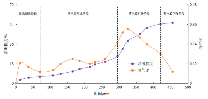 整个实验过程历时455 min,VHSD生产最终采出程度约55.6%,油汽质量比为0.17,且主要产油期在蒸汽腔扩展阶段。