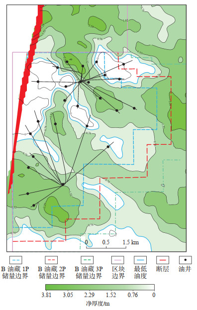 5.2 岩性油气藏储量分类分级和评估案例以厄瓜多尔安第斯项目T区块TP油田B油藏为例,对岩性油气藏进行储量分类分级和储量评估。T区块位于奥连特前陆盆地东部斜坡带[18],储量主要分布在白垩系Hollin组和Napo组,沉积环境为河流相、海陆过渡相和浅海-陆架相[19-22]。TP油田发现于2012年,发育构造-岩性油藏和岩性油藏,生产油层有5层,为白垩系Napo组海陆过渡环境[23],主要包括潮控河口湾、潮控三角洲和浪控三角洲等。其中B层沉积相为潮控河口湾的分流河道、前缘砂坝及浅海相砂坝。由于潮汐作用,砂体厚度侧向减薄且横向分布不稳定,易形成岩性油藏,砂体的侧向变化是TP油田构造-岩性油藏以及岩性油藏的主要控制因素。B油藏内目前未发现油水界面,钻遇的油层均为纯油层,根据钻探结果,具有整体斜坡含油的特征。B层多口井砂岩不存在,形成岩性尖灭(图 3)。依据RMS属性储层预测以及钻井结果,在油层顶面构造图上按照岩性尖灭位置,确定储层面积,按照最低油底确定含油面积(图 4)。