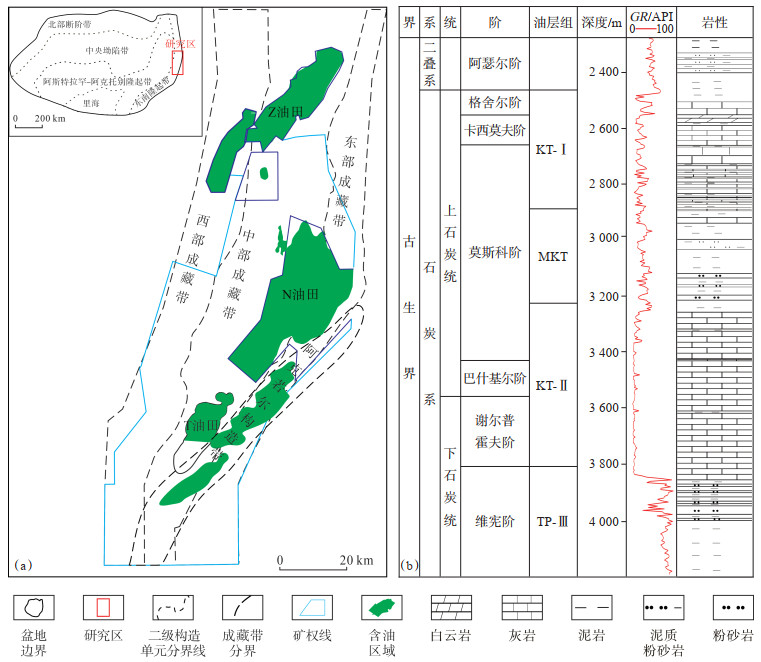 1 地质概况滨里海盆地位于波罗的板块东南部,盆地东侧为乌拉尔海西期褶皱山系[6]。泥盆纪—石炭纪—二叠纪时期,波罗的板块与哈萨克斯坦-准噶尔板块汇聚直至拼贴。泥盆纪时期,滨里海盆地东缘为弧后盆地,石炭纪时期弧后扩张,至二叠纪时期滨里海盆地东缘转化为前陆盆地[7]。滨里海盆地东缘自西向东可分为西部成藏带、中部成藏带及东部成藏带(图 1a)。东部成藏带位于油气运移指示区,油气资源丰富,是本次研究目标区。滨里海盆地东缘石炭系沉积了一套以碳酸盐岩为主的储层(KT-Ⅱ油层组、KT-Ⅰ油层组)。KT-Ⅱ油层组包括谢尔普霍夫阶、巴什基尔阶及莫斯科阶下部;KT-Ⅰ油层组包括莫斯科阶上部、卡西莫夫阶及格舍尔阶(图 1b)。滨里海盆地东缘沉积相带呈南北向展布,自西向东依次发育台缘斜坡—台地边缘—开阔/局限台地—台地边缘—台缘斜坡相沉积,可建立“双台缘”沉积模式[8-9],有利沉积相主要为开阔台地相[10-11],岩性主要为亮晶生屑颗粒灰岩、泥晶颗粒灰岩、藻黏结灰岩、微晶—粉晶白云岩、生屑白云岩及云灰岩/灰云岩类等[12-13],储层孔隙度为4%~12%,渗透率通常小于1 mD,属于低—中孔、低渗储层。