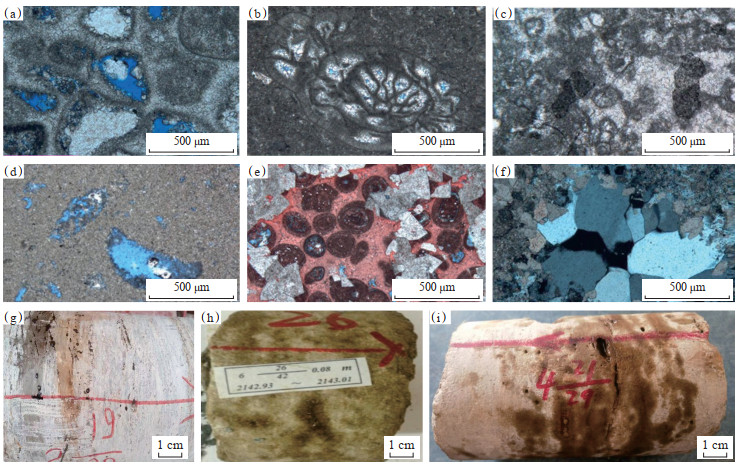 下载原图 图 2 滨里海盆地东缘主要岩石类型镜下薄片照片 (a)亮晶颗粒灰岩,T4井,2 103 m;(b)微晶灰岩,65井,2 625 m;(c)藻黏结灰岩,B1井,3 734 m;(d)粉—微晶白云岩,C63井,2 623 m;(e)云灰岩及灰质云岩,T4井,2 873 m;(f)硅化硅质灰岩,T5井,2 393 m;(g)泥晶灰岩,6井,2 274 m;(h)亮晶生屑砂砾屑灰岩,溶孔发育,T3井,2 143 m;(i)泥晶灰岩,溶蚀孔洞发育,4井,2 201 m。 Fig. 2 Thin sections of main rock types in the eastern margin of Pre-Caspian Basin |