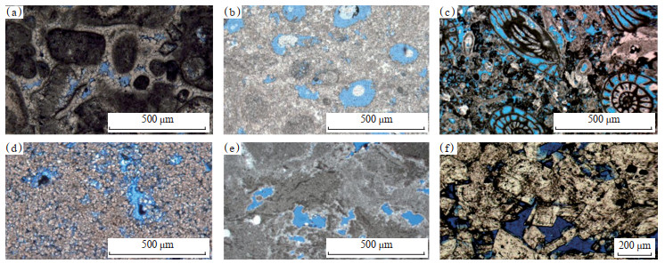 2.2.1 岩石类型及储集空间类型按照曾允孚等[16]的碳酸盐岩分类方案,研究区碳酸盐岩储集岩可分为灰岩类、白云岩类、云灰岩/灰云岩类、硅化硅质岩类等。其中,灰岩类可进一步细分为微晶灰岩、微晶颗粒灰岩、亮晶颗粒灰岩、藻黏结灰岩等;白云岩类可进一步细分为微晶白云岩、粉晶白云岩、中—细晶白云岩、中—粗晶白云岩、藻黏结白云岩、颗粒白云岩等;云灰岩/灰云岩中的白云石可分为粉—微晶白云石、粉—细晶自形白云石、中—粗晶鞍形白云石及中—巨晶白云石/鞍形白云石等;硅化硅质岩类主要见于石炭系KT-Ⅰ油层组,硅化硅质岩中的石英为微晶石英及玉髓形式,或粒状亮晶石英晶体形式,可交代生物碎屑、方解石晶体、石膏及硬石膏晶体[17-19](图 2)。