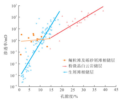 由图 4可看出,研究区石炭系鲕粒滩及砂砾屑滩相灰岩储层、生屑滩相灰岩储层、粉—微晶云岩储层的孔渗相关性差异较大。鲕粒滩及砂砾屑滩相灰岩储层显示出低孔、低渗储层特征,孔渗相关性较差;粉—微晶云岩储层显示出高孔、高渗储层特征,孔渗相关性较好;生屑滩相灰岩储层显示出特低孔、特低渗-中孔、中渗储层特征,孔渗相关性较好。由此表明,生屑滩相亮晶颗粒灰岩为研究区内最有利的储集岩性。