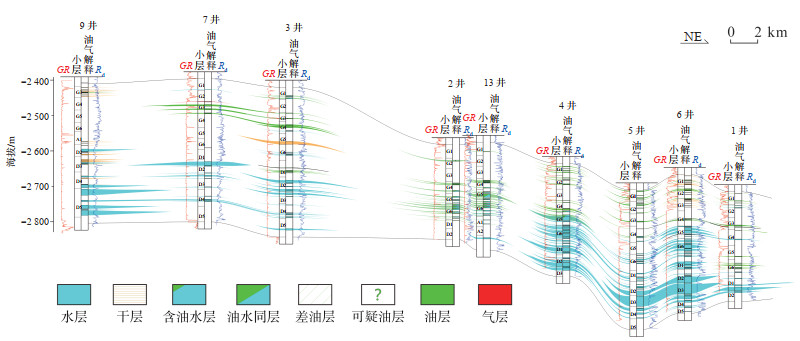 3.2 阿克若尔构造带岩性油气藏特征阿克若尔构造带位于滨里海盆地东缘的东部成藏带,呈NE向狭长状,东西宽6~12 km,南北长126 km,面积约1 100 km2,地层起伏小,构造平缓。阿克若尔构造带储层纵横向非均质性强,以薄层为主,无统一油水界面,油层多为薄层,在横向上呈分散分布,纵向上呈多层叠置分布,对比性和连续性均较差。阿克若尔构造带油藏受岩性控制明显,油层、干层、水层短距离交替分布,如2井与13井距离仅为2.19 km,但这2口井可见多处薄油层向北尖灭,至13井变为干层;6井与1井距离为4.22 km,6井KT-Ⅱ油层组底部为厚层状水层,而向北至1井,变为薄层状干层或水层(图 5)。