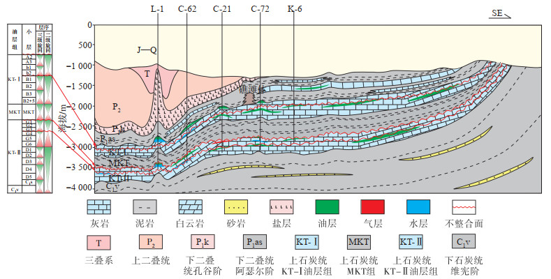 下载原图 图 5 阿克若尔构造带KT-Ⅱ油层组油气藏连井剖面 Fig. 5 Well-tie profile of KT-Ⅱ reservoir group in Aknol structural belt |