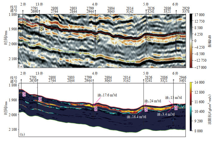 基于层位-测井约束的初始模型的地震波阻抗储层反演技术,在原理上仍是基于岩石物理测井约束[33]。该技术首先通过对地层的地震波阻抗模型进行正演模拟,获得合成地震记录;然后将合成地震记录与实际地震记录进行比对,并根据比对结果,对地震波阻抗模型进行修改;在建模时考虑多种沉积模式(超覆、退覆、剥蚀和尖灭等)的约束,使用分形和波形相似内插的方法构建复杂初始模型,模型保留了储层构造、沉积和地层在横向上的变化特征;最后通过反复比对修改,使合成地震记录和实际地震记录达到最为匹配,从而获得较为准确的地震波阻抗模型。该技术将地震和测井信息有机结合,运用全局迭代寻优反演算法,充分利用测井高频信息,提高了地震反演的精度和分辨率。运用该技术对阿克若尔构造带KT-Ⅱ油层组G1—G4小层进行储层反演,地震反演结果符合地下构造、沉积和地层特征(图 7)。由图 7可看出,G1,G2小层储层形态较地震剖面更清晰,能更好地反映储层横向连续性,岩性圈闭上倾尖灭形态明显。横向上,6井储层较为连续,向南至2井连续性减弱,储层厚度逐渐减薄。纵向上,6井附近的储层主要分布在KT-Ⅱ油层组顶部,即集中在G1和G2小层。G3,G4小层储层整体发育程度较G1,G2小层差,G3小层6井附近储层较为发育,至南部的2井逐渐减薄直至尖灭,而G4小层在南部13井附近较为发育,向北物性逐渐变差或尖灭。结合层序地层学分析,认为有利储层主要发育在三级旋回的顶部,即KT-Ⅱ油层组顶部的G1,G4小层。