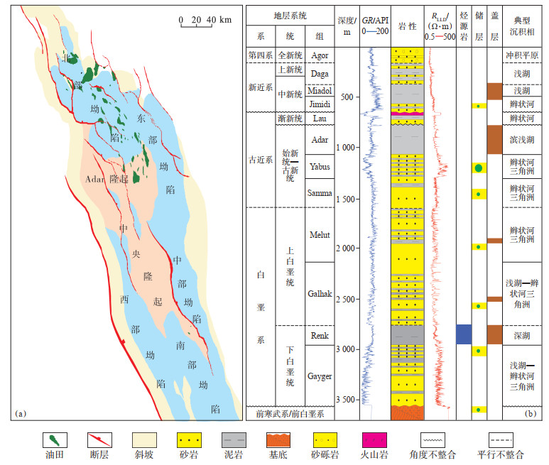 1 地质概况 1.1 Melut盆地Melut盆地面积为3.3×104 km2(其中约90% 的面积位于南苏丹境内),是中非裂谷系第二大沉积盆地,地理位置上处于中非剪切带东段南侧。该盆地具有“五坳两隆”的构造格局(图 1a),分别为北部坳陷、中部坳陷、东部坳陷、西部坳陷、南部坳陷、Adar隆起和中央隆起[1-3]。目前盆地内几乎所有的已发现油田都位于勘探程度较高的北部坳陷和Adar隆起。受中非剪切带的诱导和影响,Melut盆地于早白垩世开始形成,盆地演化共经历了3期裂陷和1期坳陷,早白垩世第Ⅰ期裂陷作用最强,沉积了Renk组烃源岩;晚白垩世—古新世第Ⅱ期裂陷作用相对较弱,初期沉积了Galhak组砂泥互层,后续沉积了大套富砂地层(包括上白垩统Melut组、古近系Samma组和Yabus组);始新世—渐新世第Ⅲ期裂陷作用再次增强,沉积了Adar组厚层泥岩;自中新世开始,盆地进入坳陷阶段,沉积了新近系Jimidi组砂岩和Miadol组泥岩。上新世,盆地进入萎缩阶段,以新近系Daga组和第四系Agor组砂砾岩沉积为主(图 1b)。