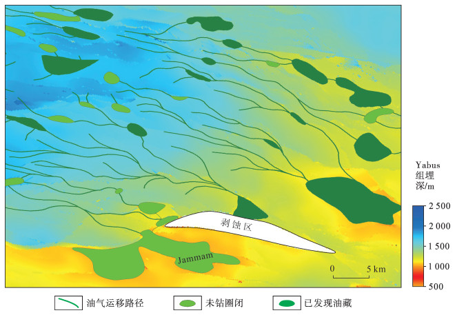 Melut盆地古近系源上储-盖有利配置层系与白垩系烃源岩的垂向距离大于1 000 m,Renk组主力烃源岩生成的原油要运聚至源上构造-岩性圈闭成藏,断裂的垂向输导起着至关重要的作用。盆地内主要发育4类断裂,即边界控盆断裂、盆缘斜坡区局部控凹断裂、古近纪第Ⅲ裂陷期形成的晚期断裂及仅第Ⅰ和Ⅱ裂陷期活动的早期断裂(图 9)。其中,边界控盆断裂与盆缘斜坡区局部控凹断裂从第Ⅰ裂陷期到第Ⅲ裂陷期长期持续活动,是沟通Renk组烃源岩与源上目的层的主要油气垂向运移通道。形成于第Ⅲ裂陷期的断裂数量多,是盆地断裂的主体,该类断裂控制了盆地源上大部分断块、断鼻等含油气圈闭的形成,同时部分断裂晚期活动强烈,向下延伸至烃源岩发育的层位,也可为源上构造、构造-岩性油藏的形成提供油气垂向运移通道。仅第Ⅰ和第Ⅱ裂陷期活动的早期断裂主要控制着盆地早期的古地貌与沉积充填,大部分断裂终止于下白垩统,对油气成藏的控制作用不明显。除了垂向油源断裂直接沟通的源上构造-岩性圈闭成藏之外,垂向油源断裂与侧向输导体系联合控制的构造-岩性圈闭也具备勘探潜力。以Yabus组为例,其上覆地层为Adar组区域厚层泥岩,垂向及侧向封堵条件均为良好,油气从Renk组生成以后,优先通过油源断裂输导至Samma组与Yabus组富砂地层,受Adar组厚层泥岩封堵影响,沿Yabus组砂体侧向输导,从构造低部位逐渐运移至盆缘构造高部位。盆缘Jammam地区Yabus组油气运聚模拟结果显示(图 10),凹陷中心生成的油气沿Jammam斜坡运移,斜坡部位优势运移路径周缘发育上倾方向具有遮挡封堵条件的构造-岩性圈闭,则油气进入构造-岩性圈闭聚集成藏。