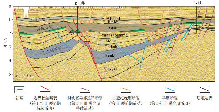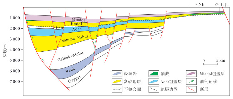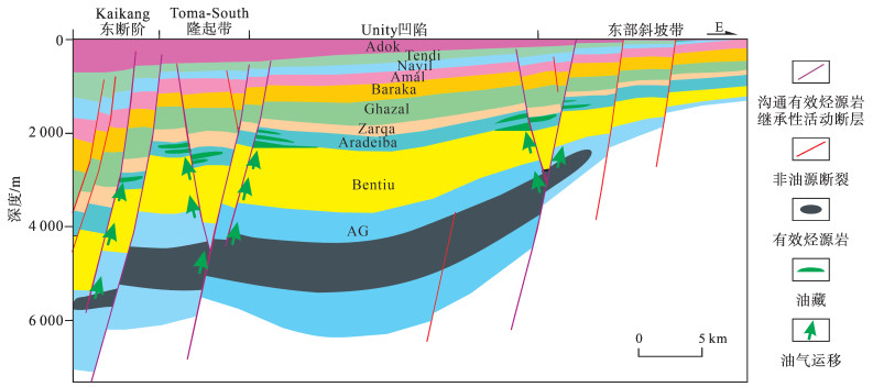 Muglad盆地断陷期以拉张应力为主,坳陷期断层活动弱或停止,正断层按活动开始时间及持续期可分为早白垩世到古近纪持续活动的断层、白垩纪持续活动断层、晚白垩世到古近纪活动断层以及古近纪活动断层4类[20]。烃源岩演化史研究表明,盆地油气充注主要发生于晚白垩世Darfur群沉积中后期[21],因此沟通AG组油源的前2类断层为Aradeiba组源上构造-岩性圈闭成藏提供了重要的油气运移通道,形成早期油气聚集(图 11)。古近纪断层整体活动强度较弱,但在活动较强的局部地区,早期油气藏被破坏并重新运移,受控于早期圈闭类型、晚期断层活动特征及断层侧向封堵能力,在古近系局部形成次生油气藏[22]。由于盆地东部斜坡带近物源区Aradeiba组砂岩发育,而AG组有效烃源岩不发育,该区域不具备形成构造-岩性成藏的条件。因此,Muglad盆地Aradeiba组构造-岩性油气藏主要发育在Toma-South隆起带,Kaikang东断阶带以及东部斜坡带的近凹地区。