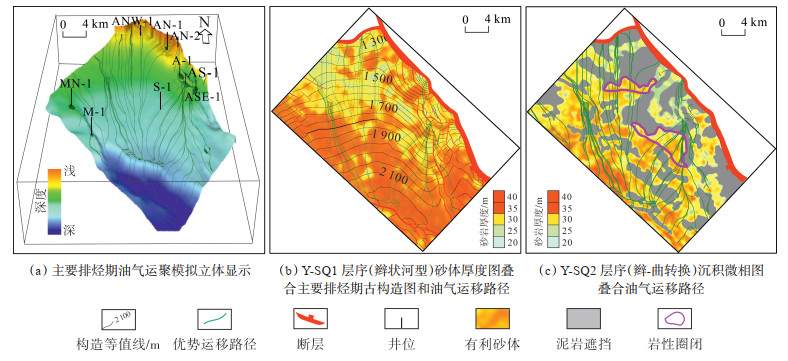 以Melut盆地北部坳陷东部的Abyat凹陷斜坡区为例,Y-SQ1层序以发育辫状河型水下分流河道为特征,砂体垂向叠置、侧向拼接,厚度大且连通性好,是构造圈闭的主力勘探层段,同时,当构造圈闭不发育时,也可作为良好的油气运移输导层。该区主要排烃时期的油气运聚模拟结果(图 12a)表明,白垩系Renk组主力烃源岩生成的油气首先沿断裂带垂向运移,随后在Y-SQ1层序辫状河型水下分流河道厚层连通砂体的控制下(图 12b)沿斜坡区的3个输导脊侧向运移,形成输导脊控制下的厚层砂体高速运移通道。这3个高速运移通道呈近南北走向,与Y-SQ2层序(辫-曲转换层段)近北西—南东走向的三角洲前缘主力砂体相交,油气沿Y-SQ1连通砂体侧向运移时,只要局部接触上覆的Y-SQ2层序砂体,就会在浮力的控制下垂向输导至Y-SQ2层序,并充注受构造等值线和水下分流间湾泥岩侧向封隔带共同控制的构造-岩性圈闭(图 12c),构成“断裂-辫状河型连通砂体共同控运,辫-曲转换层段构造-岩性圈闭聚集成藏”的成藏模式。Y-SQ3层序以曲流河型水下分流河道为主,含砂率低,泥岩厚度大且横向稳定,侧向遮挡和垂向封盖条件好,是形成构造-岩性圈闭的有利层段,但因远离烃源岩层和侧向油气运移层,需借助断层垂向运移方可充注成藏。