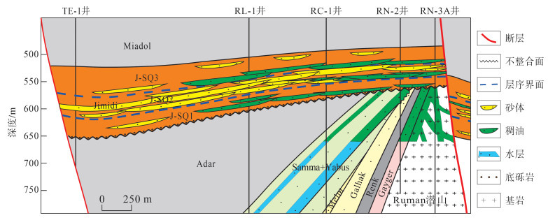 研究区内油藏解剖及稠油油藏成藏规律研究结果显示,J-SQ1和J-SQ3层序发育构造背景与河漫滩相对低孔封隔带联合控制的源上构造-岩性油藏,即相对低孔封隔带控制构造-岩性圈闭的边界,高孔隙度曲流河砂岩控制着稠油油藏的富集程度。Jimidi组在垂向上远离Renk组主力烃源岩,油气从白垩系烃源岩层系运移至新近系Jimidi组需穿越上白垩统及古近系数千米的地层,因此,运移条件是油气成藏的关键因素。Jimidi组底面为区域不整合面,是良好的油气侧向运移通道,Jimidi组油气成藏必须要有油源断裂沟通至不整合面,将深层白垩系烃源岩层系生成的原油运移至浅层,继而通过不整合面运移至Jimidi组有利圈闭成藏。以Mulet盆地Gandool地区Jimidi组稠油油藏为例[23],邻区Jamous凹陷生成的原油通过断裂垂向运移至Jimidi组底的区域不整合面,随后通过不整合面侧向运移至有利圈闭成藏,垂向运移距离超过3 km,侧向运移距离至少为25 km,属于“断层垂向运移-不整合面侧向输导型”源上构造-岩性成藏模式(图 13)。依据该成藏模式,在北部坳陷Ruman凹陷斜坡区的构造下倾方向部署了RL-1井,在J-SQ1和J-SQ3层序的构造圈闭溢出点之外获得了工业油流,进一步探索了源上规模构造-岩性油藏勘探新层系(图 14)。