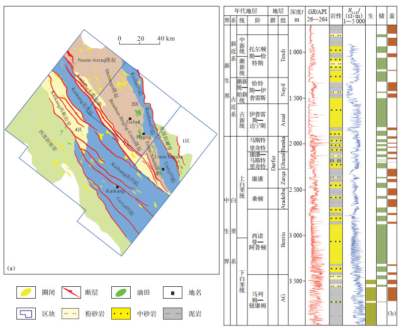 1.2 Muglad盆地Muglad盆地面积约为11.2×104 km2,位于非洲苏丹和南苏丹境内,处于非洲板块中部的中非巨型走滑断裂带端部,其形成和演化与非洲板块(尤其是中非剪切带)的演化密切相关[12]。盆地总体呈北宽南窄琵琶状,向北西方向截止于中非剪切带,向南东方向收敛于非洲板块内部,是典型的白垩纪伸展裂陷盆地(或称陆内裂谷)。1/2/4区位于Muglad盆地中南部,整体具有“两坳一隆”(Kaikang坳陷、Keilak-Bamboo-Unity坳陷、Kaikang隆起)、“两断阶两斜坡”(Kaikang东断阶带、Kaikang西断阶带、东部斜坡带、西部斜坡带)的构造格局[13](图 2a)。Muglad盆地经历了早白垩世、晚白垩世及古近纪—新近纪早期3次大型裂陷活动及相应的坳陷活动,形成3套裂陷-坳陷沉积旋回,分别为AG组裂陷沉积和Bentiu—Aradeiba组坳陷沉积、Zarqa—Ghazal—Baraka组裂陷沉积和Amal组坳陷沉积、Nayil—Tendi组裂陷沉积和Adok组—第四系坳陷沉积(图 2b)。第Ⅰ裂陷期沉积的AG组是研究区内唯一一套已证实烃源岩,与上覆坳陷期Bentiu组砂岩储层和Aradeiba组泥岩盖层共同构成生-储-盖组合,使Bentiu组砂岩成为全区最为重要的产层。