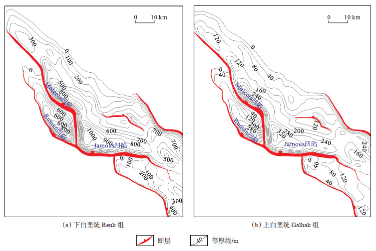 Melut盆地Renk组沉积于早白垩世第Ⅰ裂陷期(强裂陷阶段),广泛分布于各个坳陷,是一套湖相厚层暗色泥岩,坳陷中心厚度约为1 000 m,高部位厚度为100~200 m(图 3a)。岩心分析结果显示,该套烃源岩有机质类型以Ⅱ型为主[14],含少量Ⅰ型,总有机碳含量(TOC)为0.62%~2.92%,生烃潜量(S1+S2)高达19.53 mg/g,镜质体反射率(Ro)普遍大于0.5%,坳陷中心演化程度高,Ro值超过2.0%,是一套高丰度、中—高成熟度、以生油为主的优质烃源岩。Galhak组是晚白垩世第Ⅱ裂陷期水体上升过程中形成的浅湖相和三角洲前缘亚相砂泥互层沉积,坳陷中心暗色泥岩厚度约360 m,高部位厚度为20~50 m(图 3b);烃源岩有机质以Ⅱ和Ⅲ型为主,TOC值为0.50%~5.02%,Ro普遍大于0.5%,在坳陷中心近2.0%,是一套中等丰度、中—高成熟度、油气兼生的中等烃源岩。Melut盆地具有“晚期增温”的特点,其地温梯度相对主动裂谷盆地较低[14],生排烃时间相对较晚。在北部坳陷3个主要生烃凹陷中,Jamous凹陷烃源岩埋深最大,生排烃时间相对较早;Renk组生排烃史模拟结果显示,Jamous凹陷于89 Ma(晚白垩世中期)开始排烃,在55 Ma(早古近纪)开始大量排烃并一直持续到现今,而Moleeta凹陷和Ruman凹陷烃源岩埋藏深度相对较小,生排烃时间略晚于Jamous凹陷,在50~44 Ma开始大规模排烃。Galhak组烃源岩热演化过程较Renk组稍晚,但现今也处于大规模生排烃阶段。总体上讲,Melut盆地2套烃源岩的大量生排烃期时间前后相接,自晚白垩世一直持续到现今,持续大规模生排烃为源上构造-岩性圈闭的成藏提供了良好的油源条件。