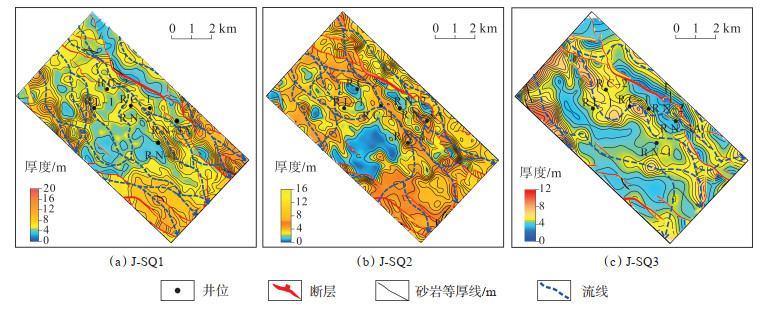 Melut盆地新近系Jimidi组以河流沉积为主,可识别出辫状河和曲流河2类河型[17]。辫状河沉积为厚层中—粗砂岩夹薄层泥岩,泥岩颜色为棕红色或杂色,单层砂体厚度为5~12 m,测井相为高幅锯齿箱形或漏斗形,在地震剖面上表现为“U”型下切,具有宽度大、下切深度中等和近似对称的特点。曲流河沉积为中—厚层、中—细砂岩与厚层泥岩互层,其中泥岩颜色以灰绿色为主,单层砂体厚度为5~10 m,测井相为高幅锯齿钟形,在地震剖面上表现为“W”型下切,河道不对称。Jimidi组河流相沉积厚度约为200 m,可划分为3个三级层序(自下而上依次为J-SQ1,J-SQ2和J-SQ3),受构造作用、基准面变化、沉积物供给及气候条件等因素的影响,从J-SQ1—J-SQ3,具有“曲-辫-曲”河型垂向演化的特征[18](图 6)。J-SQ1层序内单砂体具有二元结构,平面砂体呈弯曲长条状展布,河道曲率大,厚层砂体(边滩)呈透镜状分布于河道边部(图 7a)。J-SQ2层序内单砂体呈箱形,内部常发育多期冲刷面,平面砂体形态复杂,具网状和树枝状特征,厚层心滩砂体多发育于河道中部(图 7b)。J-SQ3层序内单砂体具有典型的二元结构,平面砂体呈弯曲长条状展布,但河道曲率大于J-SQ1沉积期发育的河道曲率,边滩规模略小,呈点状或新月状分布(图 7c)。J-SQ1和J-SQ3发育近连续分布的北西—南东向河漫滩相对低孔封隔带,为形成规模构造-岩性圈闭提供了条件。