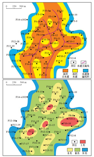 4.2 平面分布规律平面上以43-2单砂体为例,分析复合水道级次流动单元的平面分布规律。受单一水道侧向迁移和垂向加积作用的影响,复合水道内部泥质渗流屏障较为发育,水道内部渗流差异明显,造成了复合水道内部流动单元平面展布的差异性。研究结果表明,43-2单砂体内部主要发育Ⅲ类流动单元,井间连续性好,在浊积主水道、浊积水道及水道漫溢沉积砂体处均有发育;渗流能力较好的Ⅰ类、Ⅱ类流动单元分布局限、连续性差,仅在浊积水道主流线方向及主水道砂体处有分布,呈不连续的点状或带状分布;Ⅳ类流动单元呈环带状分布在Ⅲ类流动单元的外缘,在浊积水道漫溢沉积砂体处发育。总体来说,43-2单砂体平面非均质性较强,流动单元平面分布差异性明显(图 10)。