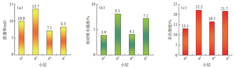 下载原图 图 2 渤海湾盆地F油田古近系沙三中亚段各小层的渗透率(a)、相对吸水强度(b)和采出程度(c)对比 Fig. 2 Comparison of permeability(a), relative water absorption strength(b)and recovery degree(c)of sublayers of middle Es3 in F oilfield, Bohai Bay Basin |