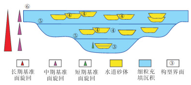 从水道体系、复合水道与单一水道3个级次开展渗流屏障分析。研究区为简单的背斜构造,钙质胶结物在储层中难以形成稳定分布的层间渗流屏障,以局部的层内渗流屏障存在,因此主要分析泥质渗流屏障。水道体系的划分界面为不同水道体系间区域稳定分布的泥质隔层,对应构型级次划分的六级(⑥)界面,为一级渗流屏障;复合水道的泥岩屏障往往为发育广泛、分布相对稳定的垂向泥质隔层,对应构型级次划分的五级(⑤)界面,为二级渗流屏障;单一水道间的渗流屏障为水道侧缘沉积或水道间的漫溢沉积,对应构型级次划分的四级(④)界面,为三级渗流屏障;水道内部充填的泥质夹层和钙质夹层,对应构型级次划分的三级(③)界面,为四级渗流屏障。其中,一级、二级渗流屏障分布稳定,所限定的储层连通体之间没有流体流动;三级渗流屏障呈不连续分布,将连通体分割成了若干个连通或不连通的储集单元;四级渗流屏障所限定的储层连通体内部再无渗流屏障的存在,连通体内的渗流特征差异只与岩相充填特征有关(图 4)。