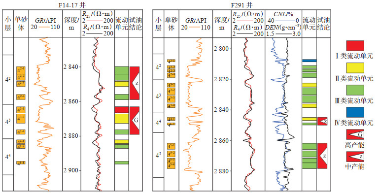 单井流动单元能够反映储层内部的渗流特征分布,因此,在构型模式的指导下进行了单井流动单元研究。首先,在垂向上区分储层与非储层;其次,针对储层的物性特征、孔隙结构特征及流动特征差异开展单井流动单元识别。如图 6所示,单井流动单元划分结果与初期产能分布具有较好的匹配关系。Ⅰ类流动单元与Ⅱ类流动单元初期产能较高,Ⅲ类流动单元初期产能一般。此外,由于同一单井的不同单一水道发育于不同的水道体系演化阶段,水道内部充填特征不同,导致流动单元类型及分布存在差异。对于不同单井的同一单层,由于水道发育位置不同,水道内部充填特征也存在差异,导致井间流动单元分布不同(图 6)。
