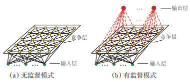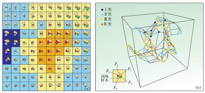 自组织映射(SOM,Self-Organizing Maps)神经网络算法是Kohonen[18]于1982年提出的一种无监督模式下的聚类分析算法,包括输入层和竞争层2层神经网络结构(图 7a)。输入层的节点数即为流动单元输入样本的维数,当接收到流动单元样本的输入特征时,位于竞争层的神经元相互竞争对输入模式获取响应的机会。最终,获胜的神经元兴奋,失败的神经元受到抑制,获胜的神经元即为输入样本的流动单元分类。