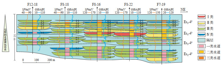 下载原图 图 9 渤海湾盆地F油田古近系沙三中亚段流动单元与单一水道剖面分布特征 Fig. 9 Distribution of flow units and single channels of middle Es3 in F oilfield, Bohai Bay Basin |