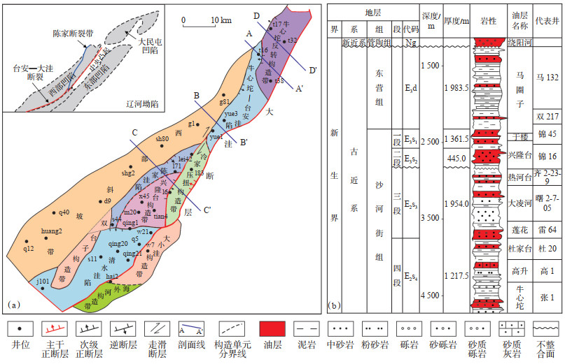 1 地质概况辽河西部凹陷为辽河坳陷的次级构造单元,是我国东部油气资源丰富的地质单元之一,也是重要的石油产出基地[16-17]。陈家断裂带位于西部凹陷中北部,主要包括台安洼陷和牛心坨洼陷2个洼陷区,该断裂带由北向南分为牛心坨反转构造带、牛心坨—台安洼陷、冷家压扭构造带3个次级构造单元,其中牛心坨—台安洼陷为西部凹陷北部主要的生烃洼陷(图 1a)。根据钻井、地震资料,结合邻区地层资料[18],研究区自下而上分别发育古近系沙河街组四段、沙河街组三段、沙河街组二段、沙河街组一段、东营组以及新近系馆陶组(图 1b)。其中沙三段和沙四段为研究区的主要生油层系,陈家断裂为早期控制区域沉积的主干断裂,发育巨厚的暗色泥岩和油页岩,是油气形成的基础。研究区内发育以沙四段下部砂岩与上部泥岩形成的一套上生下储组合、沙三段下部砂岩与上部泥岩及下部沙四段泥岩构成的一套下生上盖组合,具有油气成藏的基础。